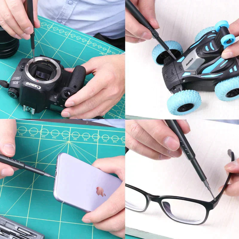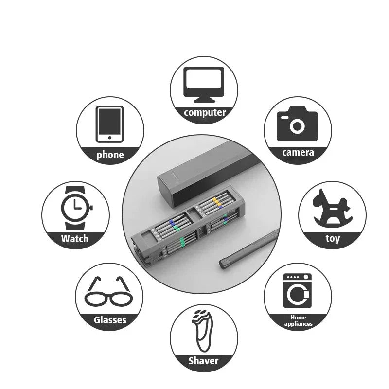 - 🔧 24 końcówki precyzyjne – różnorodność do każdej naprawy, od małych śrubek po bardziej skomplikowane zadania.